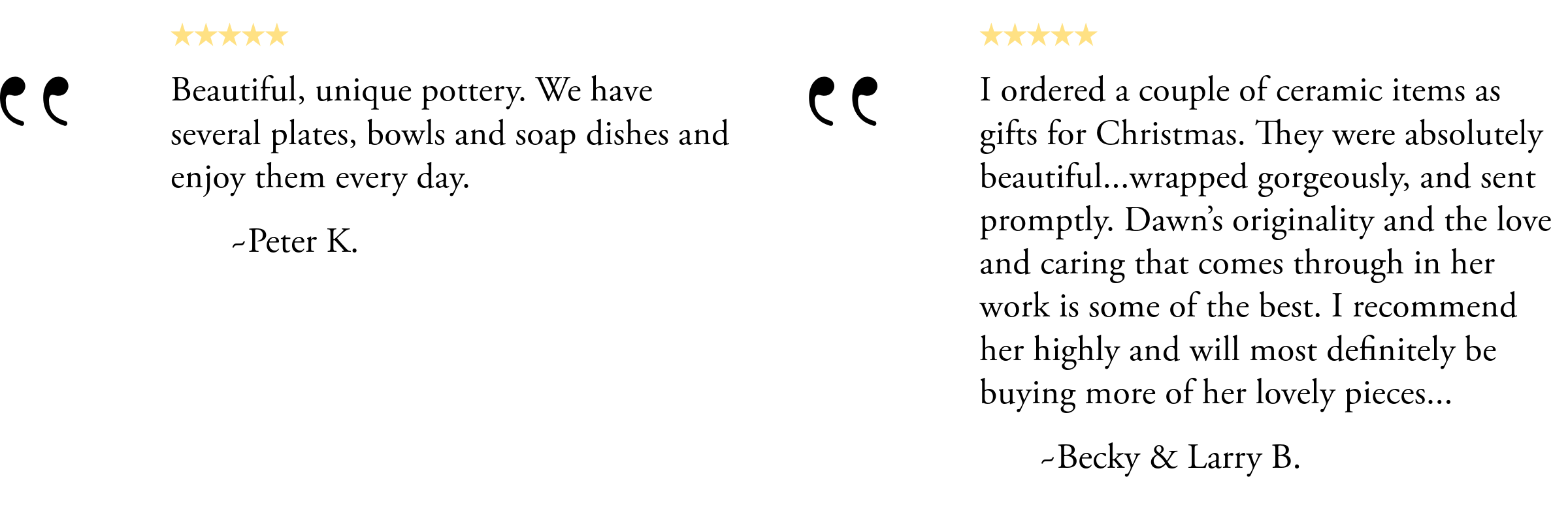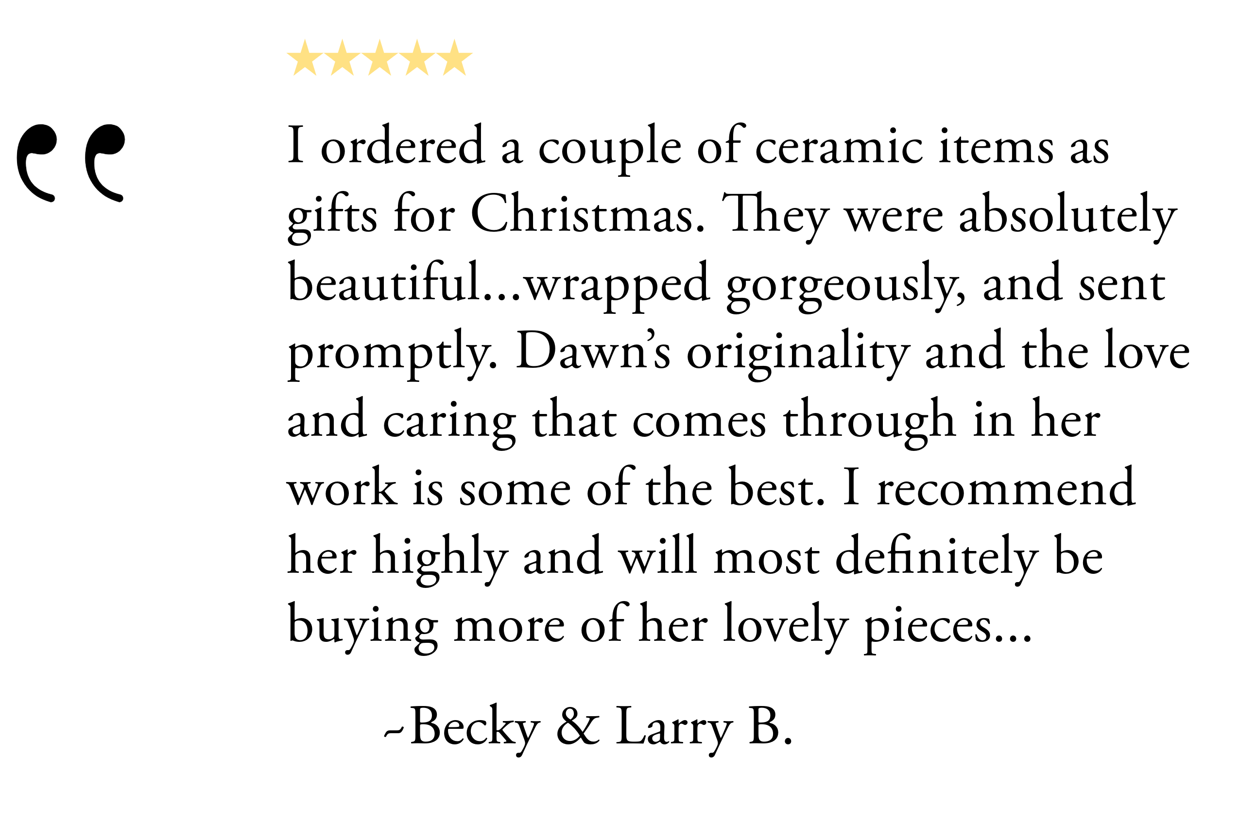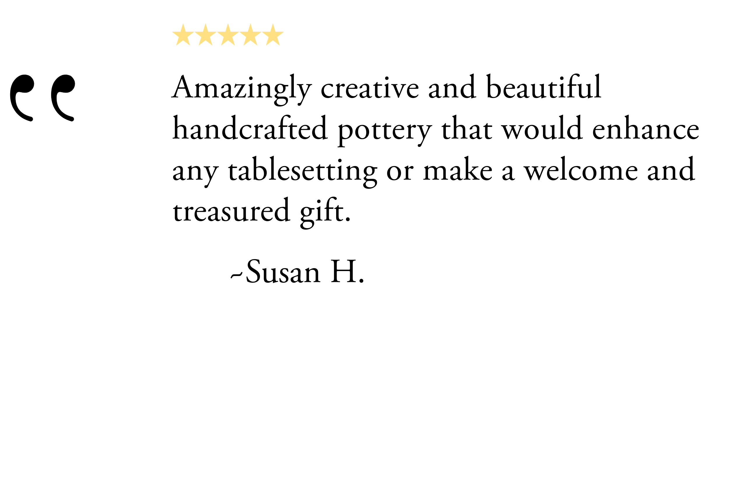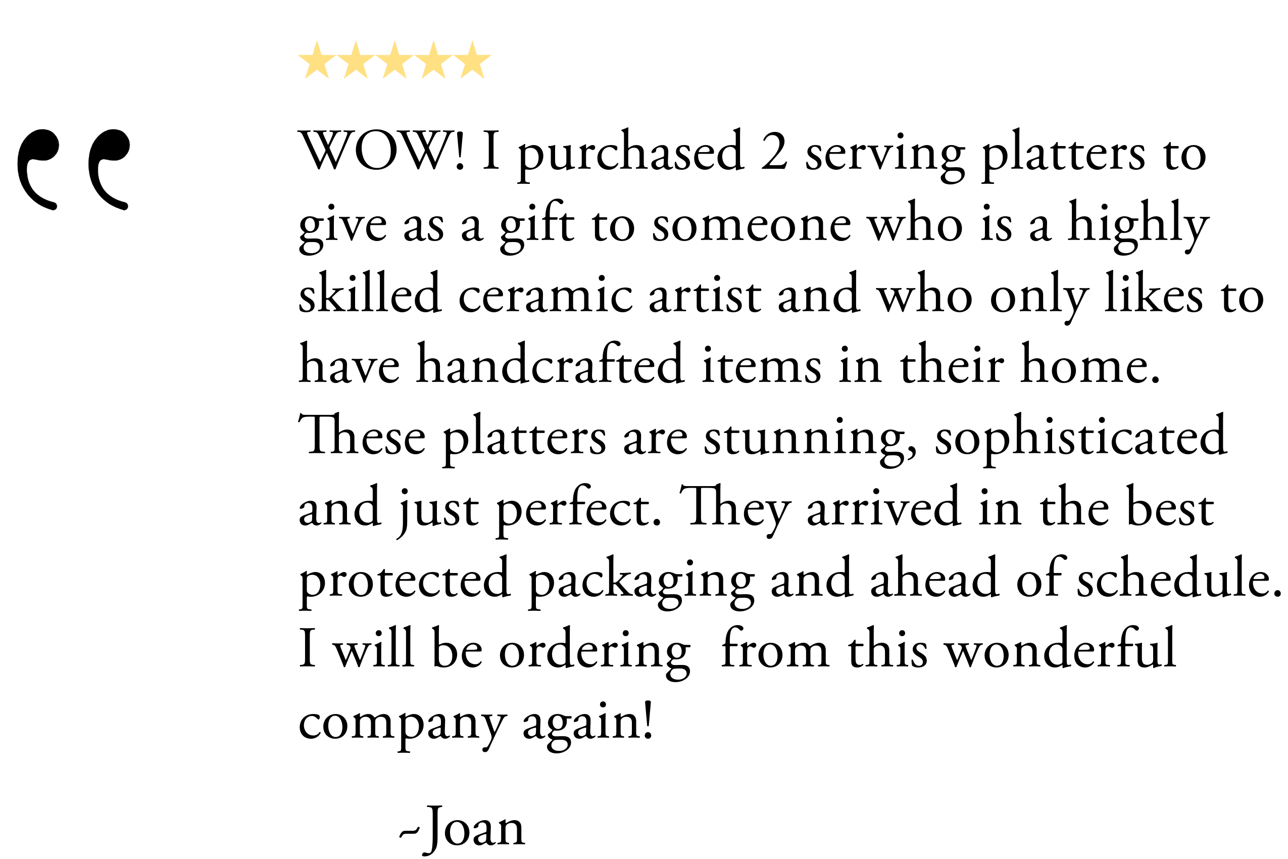 Our ceramics are made to order specifically for you and take approximately 3-4 weeks to complete. Ceramics take time and we want you to have the very best pieces that will last a lifetime or more. If you will need your order in a shorter time frame, let us know, and we will do our best to accommodate you. RUSH fees may apply.