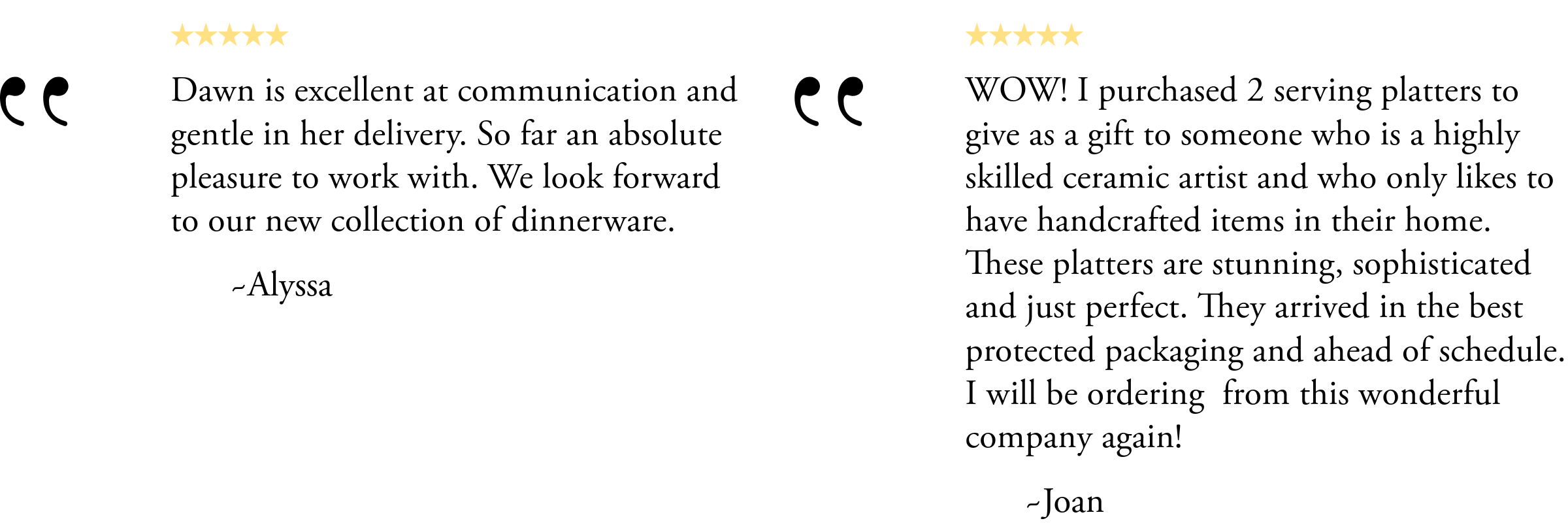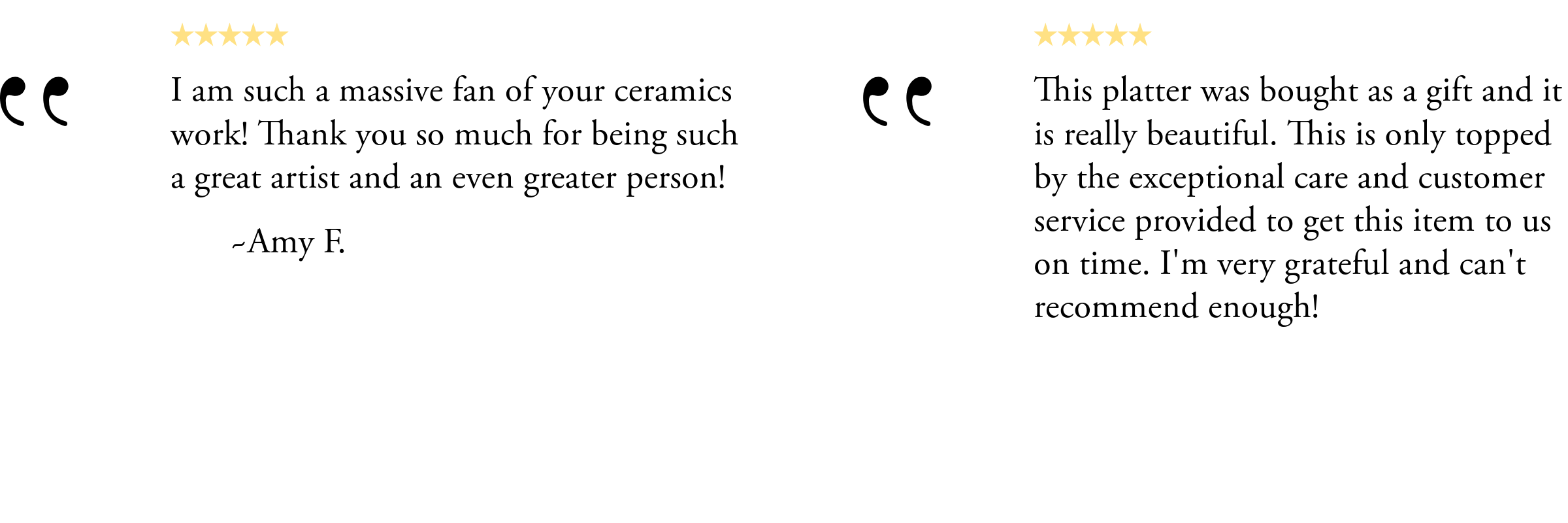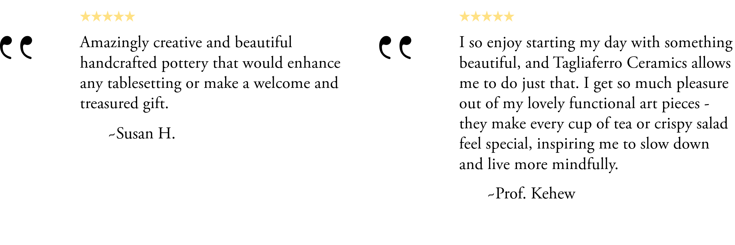 Buyer is responsible for return shipping costs to our studio. Tagliaferro Ceramics is not responsible for any damage or loss that occurs when return shipping. We strongly encourage you to pack the items well and ship via a trusted carrier. Please include a copy of your packing slip or invoice with your return.