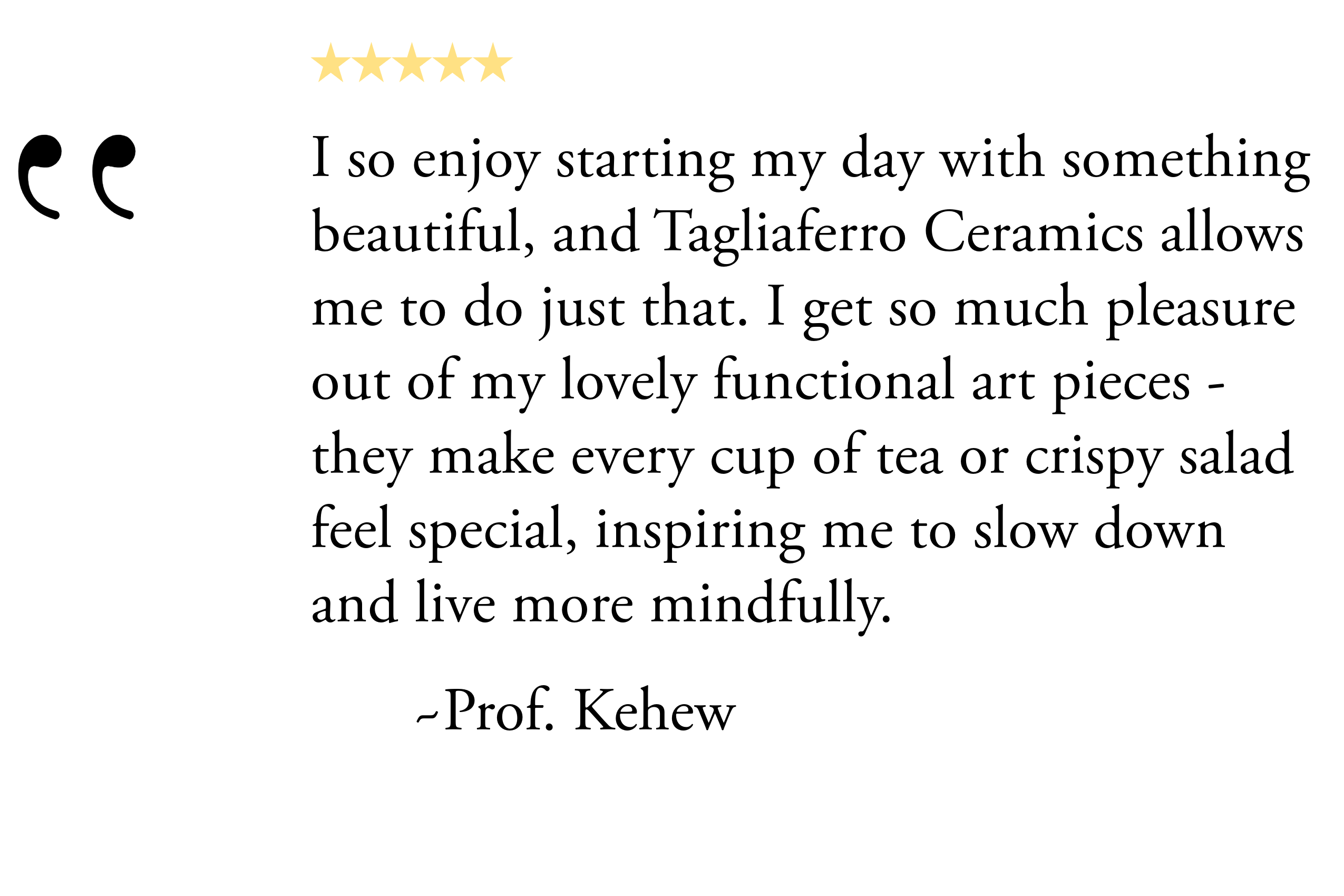 Tagliaferro Ceramics come with a one year replacement warranty on any manufacturing defects, excluding seconds and one of a kind pieces.